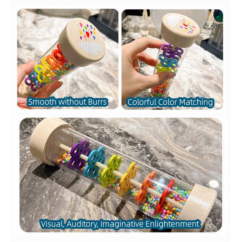 - Color Cognition : This baby musical instrument toy uses the rainbow color design to help children recognize and distinguish different colors, attract children's attention, and stimulate their color cognition. The rain sound tube simulates the real rain sound, so that children can feel the fun of rainy days indoors