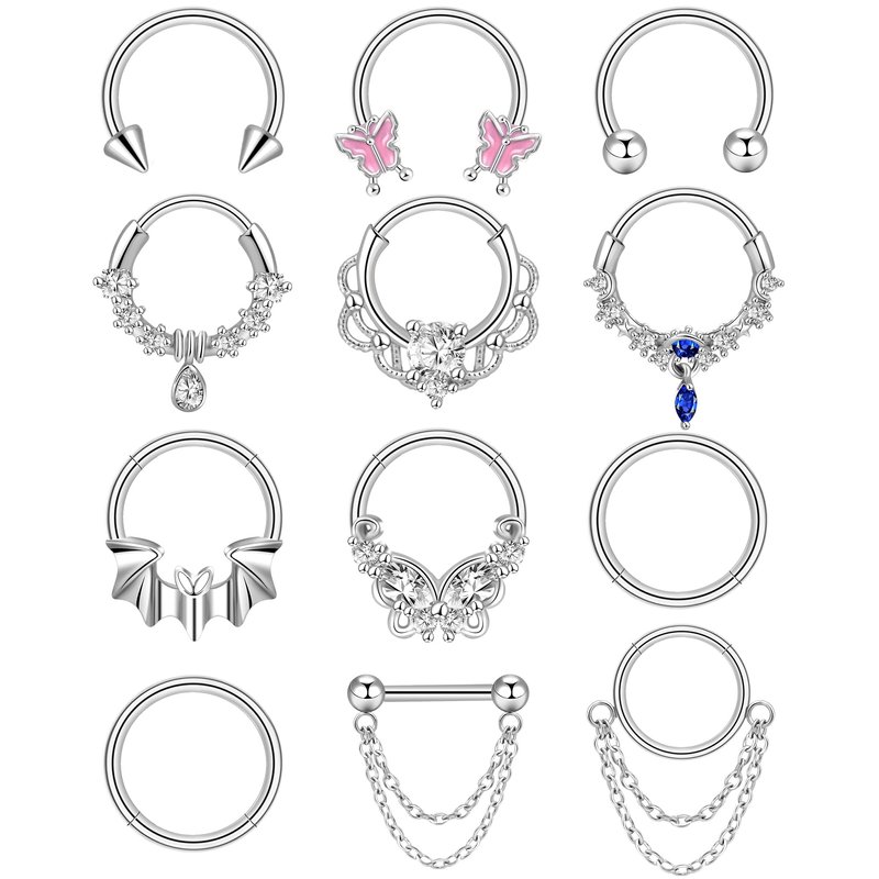 - PACKAGE INCLUDE - A plastic box come to you with 12 pcs small septum rings for women in silver color, includ plane dangle chain septum ring, butterfly, teardrop, bat, horseshoe, CZ and chain styles. Dainty septum piercings can easy match your daily wear and make you look more fashionable.