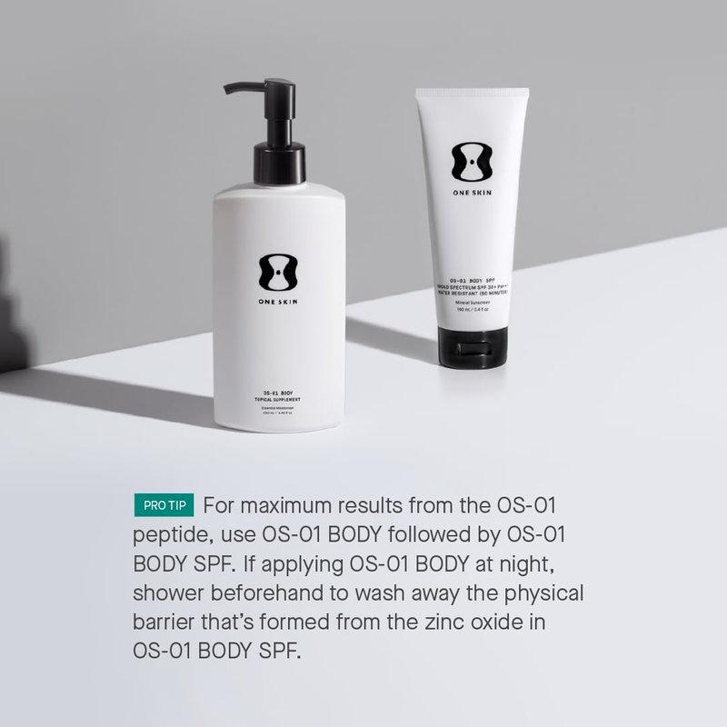 Why settle for basic sun protection? Powered by our proprietary OS-01 peptide, plus non-nano zinc oxide, and a blend of potent antioxidants, OS-01 BODY SPF targets skin aging at the cellular level, prevents collagen loss, and protects against UV damage. (01) This lightweight, hydrating SPF, absorbs quickly, is water resistant for up to 80 minutes, and is suitable for all skin types. Think of it as a trifecta of daily protection for healthy, smooth, and glowing skin.