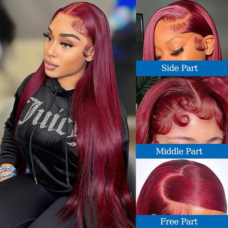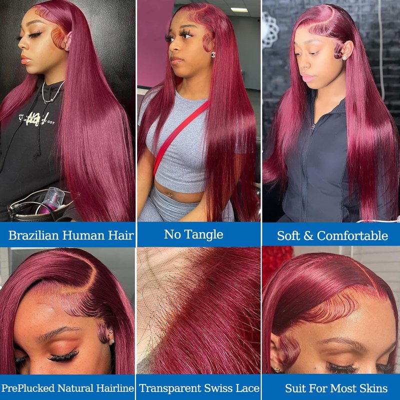 Wigs Type: Lace Front Wigs Human Hair, 100% Brazilian virgin Unprocessed Human Hair. Hair Length: Lace Front Human Hair Wigs 20-32 inches Available. Hair Weight: Depending on Hair Length. 150% Density, Full and Thick. Advantages: 1. No Shedding, No Tangles, True to length/Healthy Ends. 2. Pre Plucked Natural Hairline with Baby Hair. 3. Beautiful Burgundy 13x4 Lace Front Wigs Human Hair. Transparent HD Lace Frontal Wig Pre Plucked Bleached Knots. 4. Glueless Human Hair Wigs, Baby Hair Around, Pre plucked, Natural Hairline. 5. 99j Wig Burgundy Lace Front Wigs Human Hair. Can be Permed, Can be Braided, Can be Restyled to All Kinds of Hairstyles You Want. 6. Human Hair Lace Front Wigs are Shedding Free, Tangle Free, No Dry End.