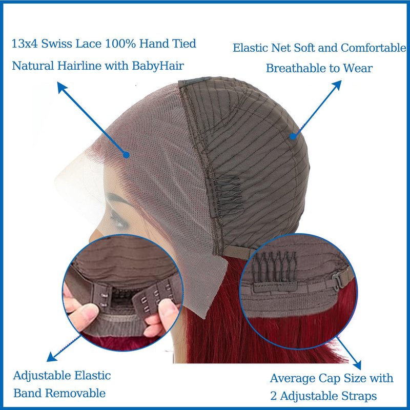- Cap Size: Medium Cap Size(22.5 inch circumference size). Burgundy lace frontal wig with 2 Adjustable Straps,elastic strap 4 combs, fit most people.