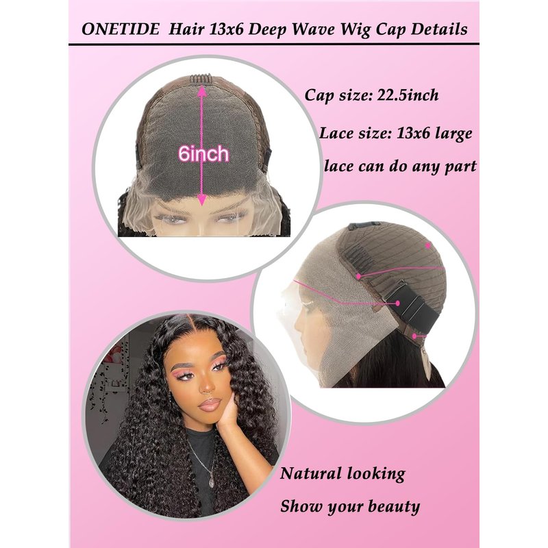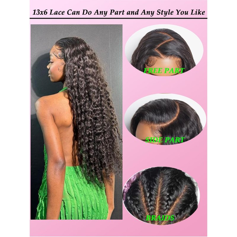 13x6 deep wave lace front wigs human hair : transparent Swiss Lace, blends perfectly into your skin, soft and breathable, there is enough room on the lace part for you to be versatile with styling; Soft human hair wigsr: when you receive the hair, you can feel it with your fingers, ran your fingers through the hair and it is sooo soft and silky, Because the material we use is 100% Virgin Human Hair. True to length deep wave wigs: Real length allows you to get the length you want, we have 22-32 inches for you to choose from, if it's your first time to buy, we suggest you to choose 24 inches, you can feel our quality with less money first, if you feel it's still good, we suggest you to choose a longer length next time