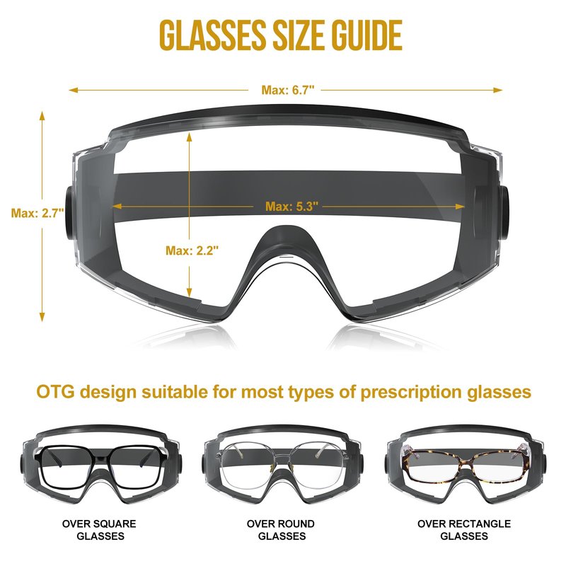 - 【OTG Design】Our tactical goggles are designed to fit with regular prescription glasses (Max size: 5.3" length, 1.65" width), providing clear vision and top-notch eye protection. NOTICE: Please ensure that the frame of your prescription glasses falls within this size range before placing your order to avoid any misfit or discomfort.