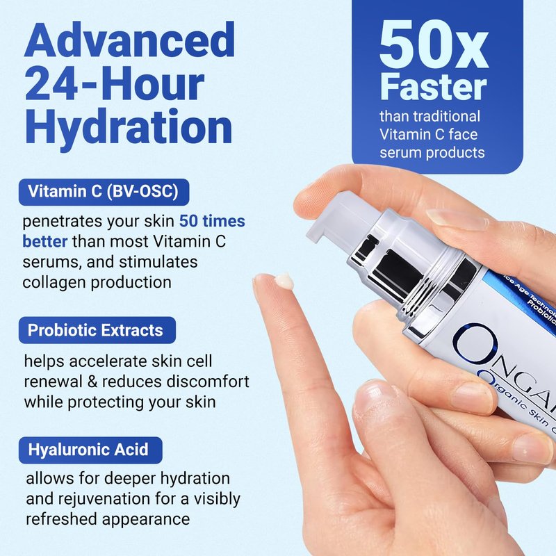 - ADVANCED 24-HOUR HYDRATION: We use advanced Vitamin C (BV-OSC), Probiotic Extracts, & Hyaluronic Acid to penetrate the skin 50 times faster than traditional Vitamin C face serum products. Allowing for deeper hydration and rejuvenation for a visibly refreshed appearance. With regular use of this hyaluronic acid moisturizer, you can enjoy healthier, younger-looking skin in as little as 30 days.