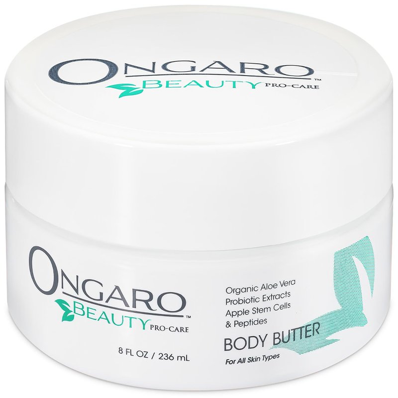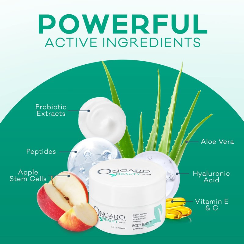 Ongaro Beauty Anti-Aging Body Butter. Deep Nourishment Meets Luxurious Care. Experience the ultimate body butter cream in skin rejuvenation with Ongaro Beauty’s Anti-Aging Body Butter, expertly crafted to cater to both men and women seeking superior skincare. This rich body cream is infused with a powerful blend of Probiotic Technology, Apple Stem Cells, and Peptides, designed to deeply nourish your skin and enhance its natural elasticity. Our natural body butter features 100% pure USDA-Certified Organic Aloe Vera, ensuring your skin enjoys the purest touch of nature. 24-Hour Hydration: Our whipped shea and cocoa butter formulation is delightfully light yet incredibly hydrating. Enriched with grape seed oil and chamomile, it absorbs quickly, leaving your skin soft, supple, and non-greasy. With each application, our body butter helps accelerate the skin cell renewal process, helping to protect, firm, and rejuvenate your skin for all skin types. Whether your skin is dry, oily, normal, or sensitive, our versatile cream adapts to meet your skin’s specific needs. It's gentle enough for daily use and robust enough to handle the unique challenges of both men’s and women’s skincare routines. Scents and Sensations: Indulge in our exquisitely scented options—choose from soothing vanilla body butter tropical coconut body butter. Each variant is meticulously blended to provide a sensory experience thats delightful. Free from sulfates, petrolatum, mineral oil, parabens, and gluten, our whipped body butter promises nothing but nature’s best. It's your daily dose of thick body butter, scented, and luxuriously whipped lotion that supports the skin. We at Ongaro Beauty understand that personal care is unique. Try our best body butter bulk. Embrace the path to radiant, hydrated skin with Ongaro Beauty’s Anti-Aging Body Butter. Dive into the rich, whipped luxury—because your skin deserves the best of care and the finest ingredients. Transform your skincare routine with our shea body butter for women