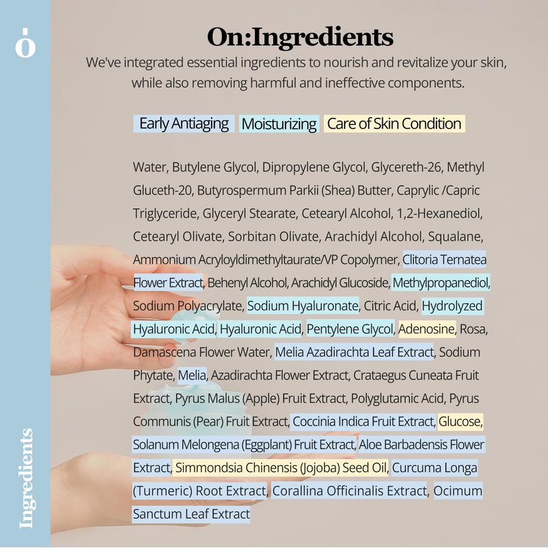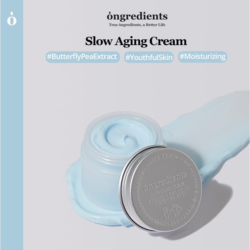 Introducing Ongredients Slow Aging Cream, an exceptional early anti-aging solution that elevates core elasticity. Enriched with the potent antioxidant Butterfly Pea Flower, this cream harnesses the power of Anthocyanin, a remarkable compound that effectively prevents skin aging and improves overall skin condition. It specifically targets the weakened butterfly zone, comprising both cheeks, enhancing elasticity by over 10% and fortifying the skin's core in the diamond zone across the face. By slowing down the aging process, it addresses fine lines and wrinkles, leaving the skin firm and resilient. The cream boasts a chewy texture that effortlessly fills the skin without any stickiness. With its rich concentration of active ingredients, it provides deep moisture and is quickly absorbed, imparting elasticity and a silky finish, resulting in a solid and firm complexion. Experience the transformative effects of Ongredients Slow Aging Cream for visibly younger-looking skin.