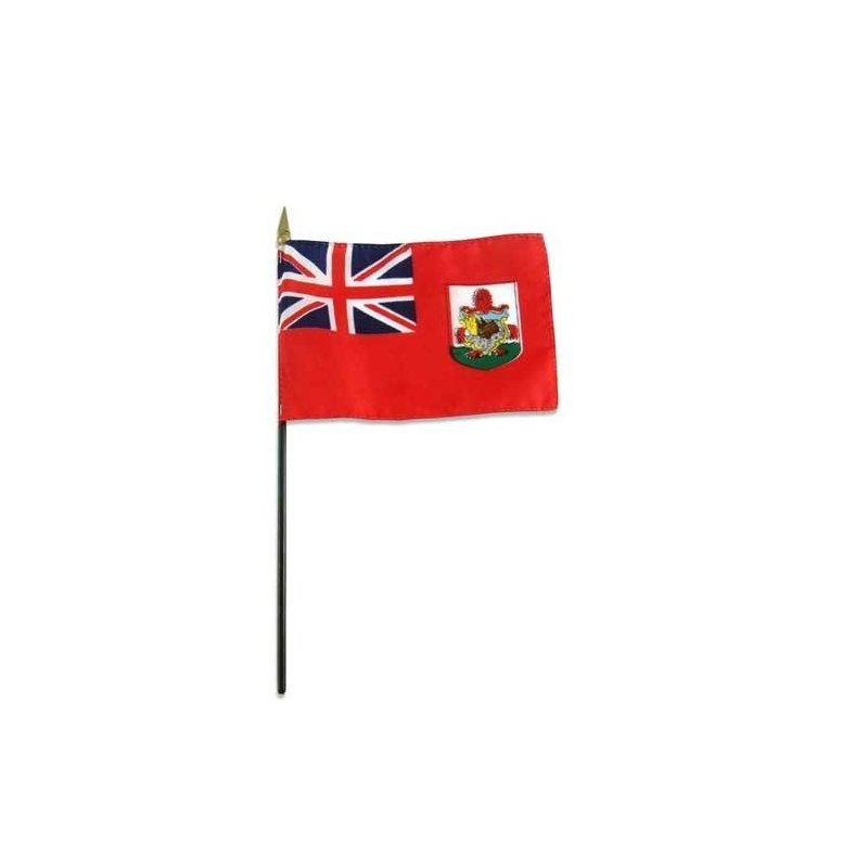 Bermuda stick flag 4 inch x 6 inch, mounted on a 10 inch plastic stick. Flag is made from polyester and printed in bright colors to make an attractive flag. Each flag is individually sewn around the edges.