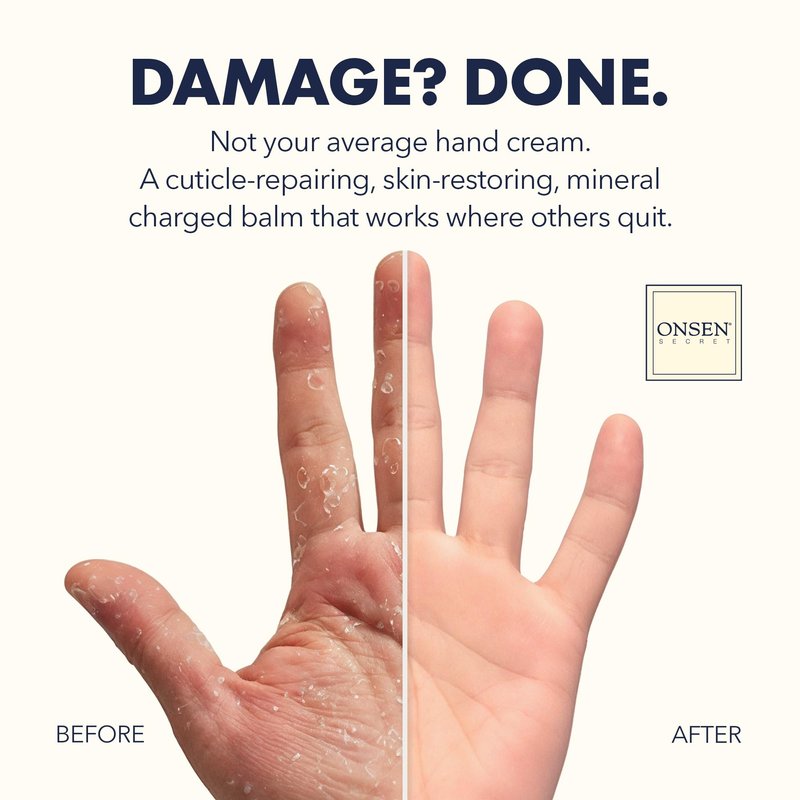 - MULTI-PURPOSE HAND & CUTICLE CREAM – Compact yet ultra-effective, the Hand and Cuticle Rescue Cream targets dry, cracked areas with mineral-rich Onsen water, Carnauba wax, and plant-based emollients. Perfect for hands, cuticles, elbows, and feet.