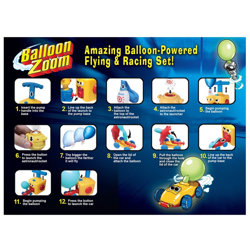 - Balloon-Powered Race Car Launcher Toy: This amazing, balloon-powered racing and flying toy set provides hours of fun; Simply attach the balloon, pump it up, and launch the aerodynamic vehicles; No batteries or chargers required!