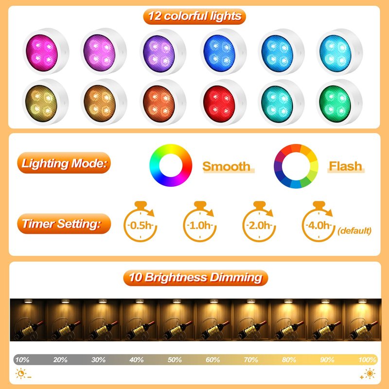 - ▶Auto-Off Timer lights: The default timer is 4 hours, the puck lights will remain on for 4 hours and then automatically turn off. Also you can use the remote conrtoller for one-time set make the puck lights stay on for a shorter period among 30, 60 or 120 minutes.