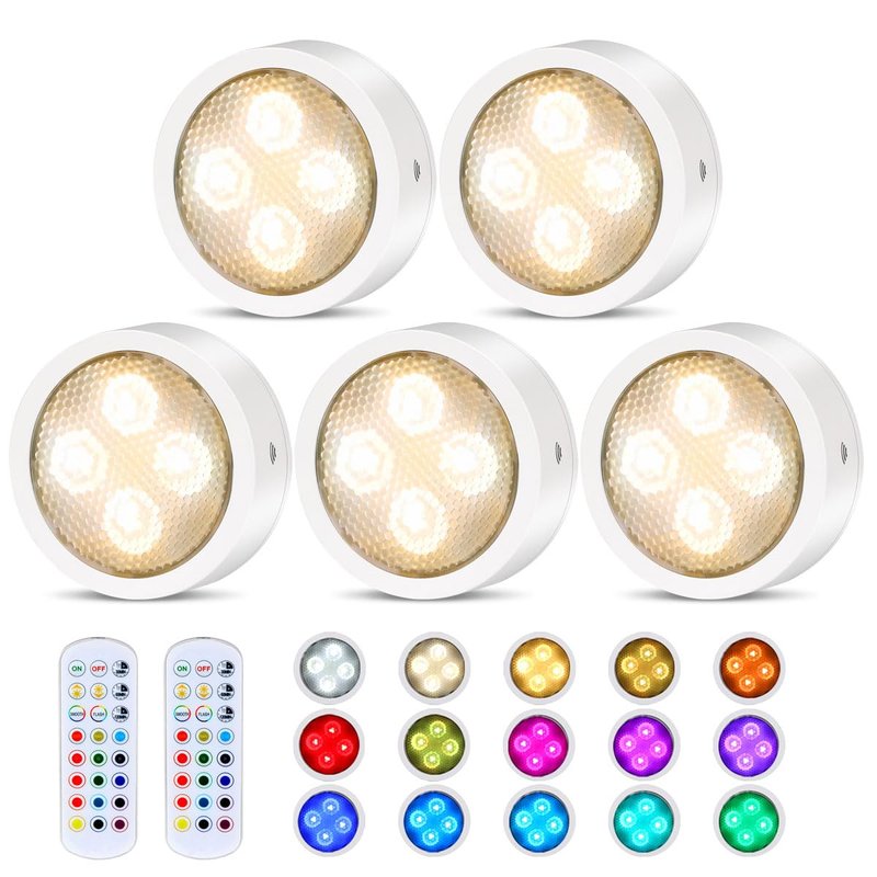 - ▶Remote Control Lights: Comes with 2 handy remotes, easily control battery puck lights even in hard-to-reach places. Use the remote to customize your favorite light color among 15 static light colors and 3 dynamic light modes, quick dim the brightness level from 10 to 100%.