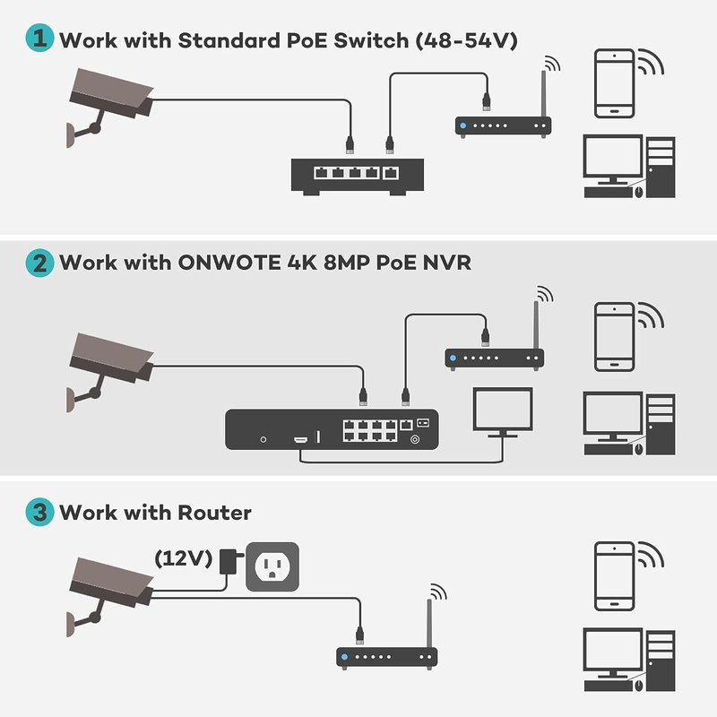 - 【Multiple Working Solutions】Work with ONWOTE 5MP PoE NVR, and can be added; Work with Standard PoE Switch with 48V-54V power supply.
