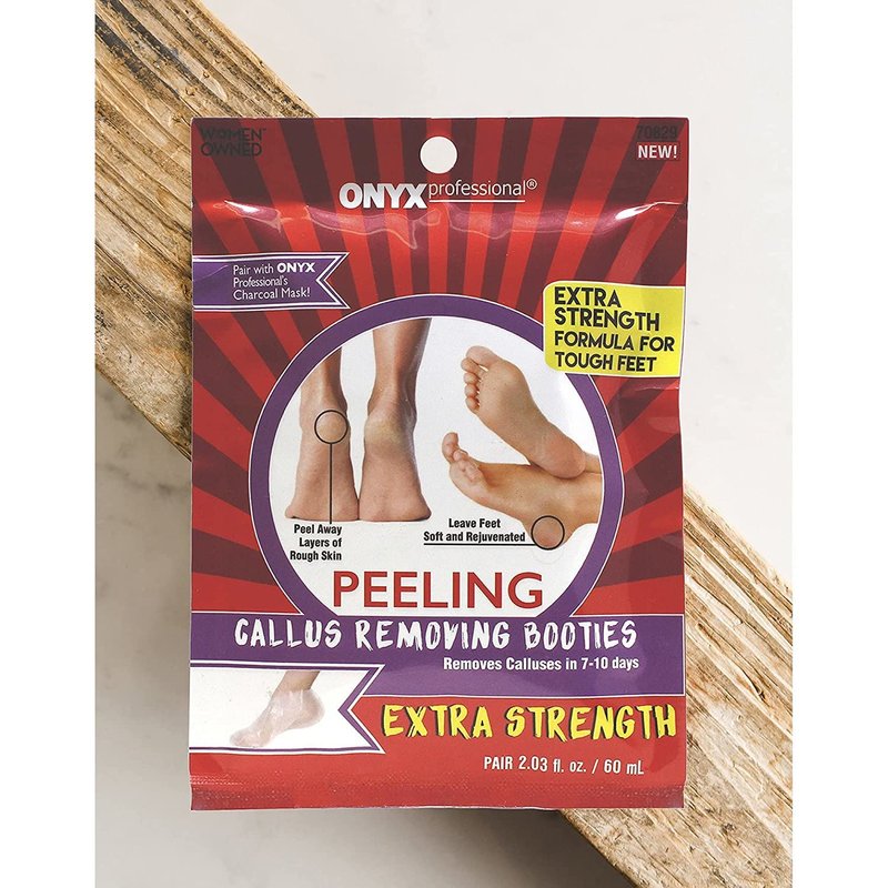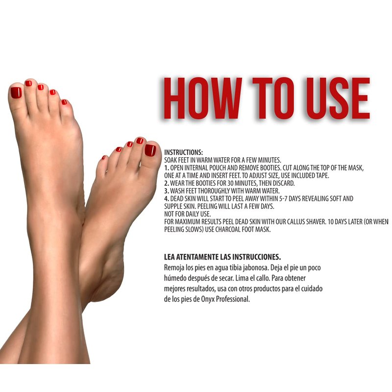 Do You Have Calluses, Hard Skin or Need Dry Cracked Heel Treatment? Get rid of calluses and dry skin with Onyx Professional’s Extra Strength Calloused feet Remover Booties! Whether your feet are cracked, in need of feet callus removal or simply tired from being on them all day our large feet mask will exfoliate and gently peel rough dead skin so that you can finally have that baby feet feel again. Our feet peeling mask has a fast-acting formula that quickly breaks down thick calluses and provides deep corn removal leaving you with baby soft, smooth skin in as little as seven days. Our special blend of 7 different plant extracts helps this foot peeling mask pack a powerful punch leaving a gentle, revitalizing experience that will result in soft heels and smooth feet. More than that, our foot care treatment is laced with exfoliants and nourishing ingredients that will slowly shed the outer layer of dead, dry, or coarse skin and leave you with exfoliated, soft, and healthy feet in no time. Safe for women and men with all skin types, foot shapes and sizes up to size 11. Use this Foot Peel Mask to get skin regenerating again and becoming free of rough, dry, dead skin. So, if you’re a person on the go looking for the best callus remover for feet or someone in need of athletes foot treatment we have you covered. Pamper your feet and give them the look they deserve with Onyx Professional’s Callous Remover Peeling Foot Mask Be sure to check out our best selling pumice stone that works great with our feet peel masks.
