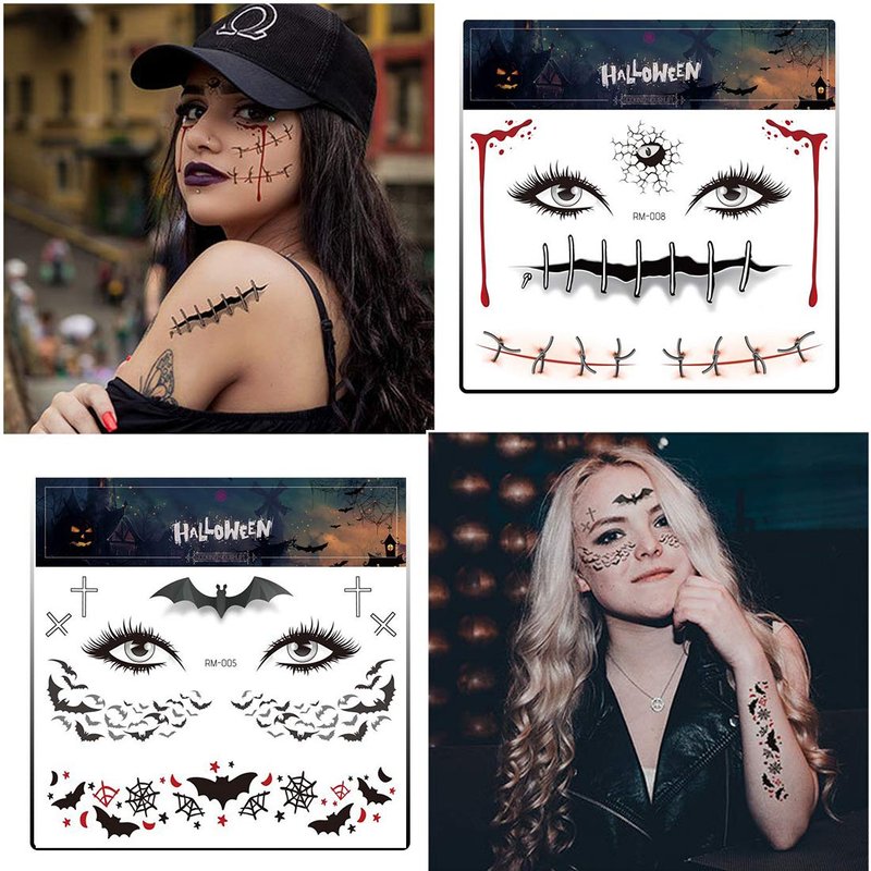 - ★9 SHEETS HALLOWEEN FACE FAKE TATTOOS-- 9 premium sheets all in one package, 6.22X6.22"inch. Including different styles, features bat, spider, and bloody designs. Scars seem very true and natural, Great trick to astonish and scare your friends.
