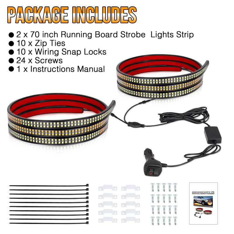 - EASY TO INSTALL& PACKAGING: Emergency light bar easily to install, there is no need to drill,just clean the mounted surface and peel and stick the light strip for installation.Packaging Included:2PCs 70inch Running Board Emergency Light Strips, 1 x Instructions Manual, 10 x Zip Ties,10 x Wiring Snap Locks ,24 x Screws.