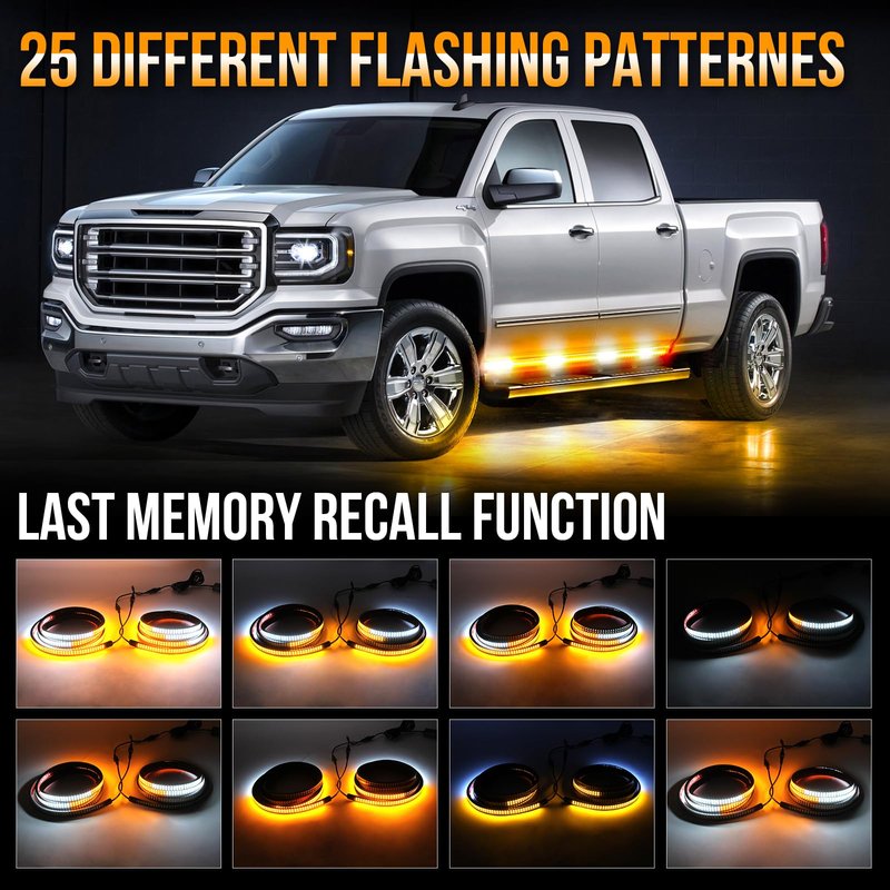 - 25 FLASHING PATTERN: OPL5 newest series 2 in 1 truck lights strip with 25 Different patterns of strobing/flashing was controlled through the cigarette lighter switch,just a press of a button ( Rotating, Flashing, Alternating Between Left and Right Side, etc. ) warning flashing patterns to choose from that will ensure you driving more safety and warns other vehicles more effectively .Last pattern memory recall function.