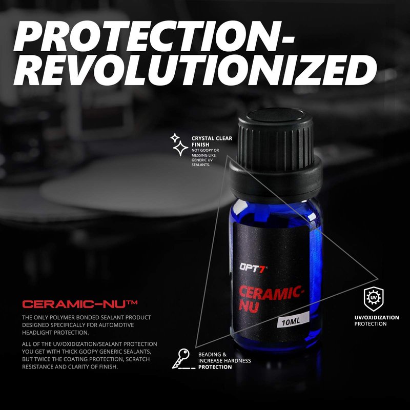 OPT7's the first headlight restoration kit to bring you the latest in ceramic bonded coating that delivers durable protection from the elements using ceramic chemical bonding. Unlike other UV protectants that leave a sticky coating or gel that tacks onto your freshly restored headlight, Ceramic Pro chemically bonds (cures) with your plastic headlight resin and the extra material simply wipes away. Using Ceramic Nu will provide your headlights with the best possible protection from UV, tar, oxidization for up to 18 months before an additional coat is needed.