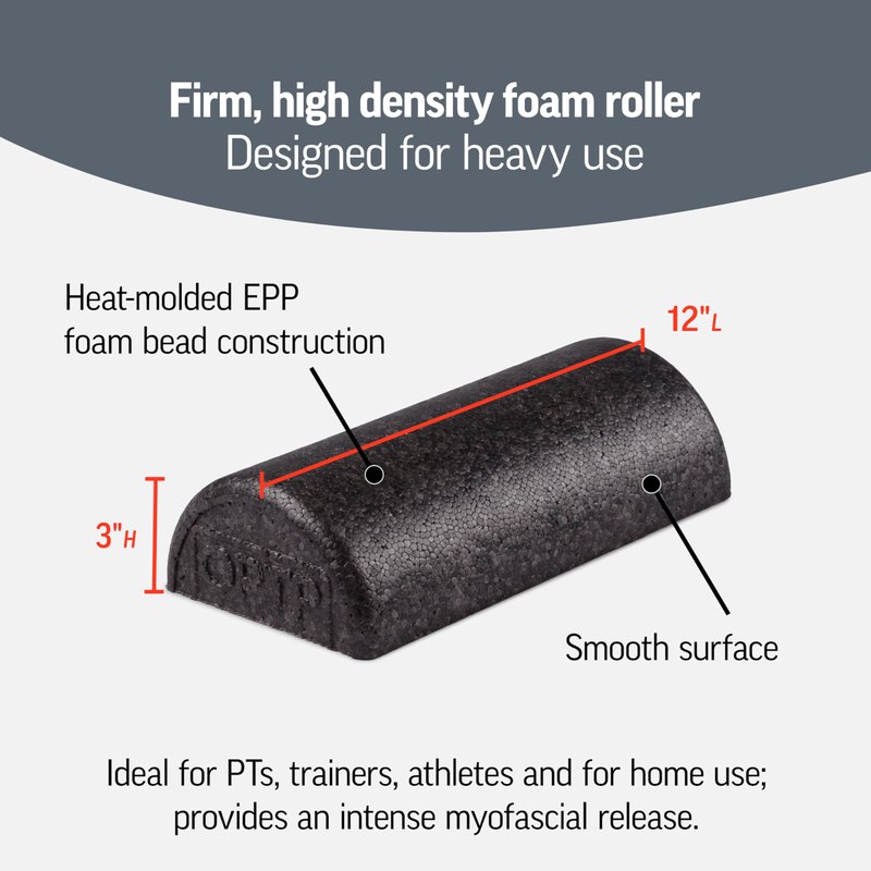 Foam roller 12 inch: This firm density foam core roller is designed to perform better than other small foam roller competitors, thanks to premium EPP heat-molded rolling foam construction. Use the 12 in half foam roll as a yoga back roller, thigh roller, upper back stretcher, hip release tool, quad roller, and more. Preferred by fitness professionals and athletes for its durability and lasting power, the OPTP Black AXIS Foam Roller is firm in density easy to hand clean. AXIS foam rollers provide an intense myofascial release and will not lose their shape, even after heavy use.