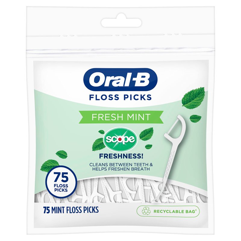 - You will receive (6) 75 count bag of Oral-B Burst of Scope Floss Picks, Fresh Mint flavor (450 Floss Picks Total)