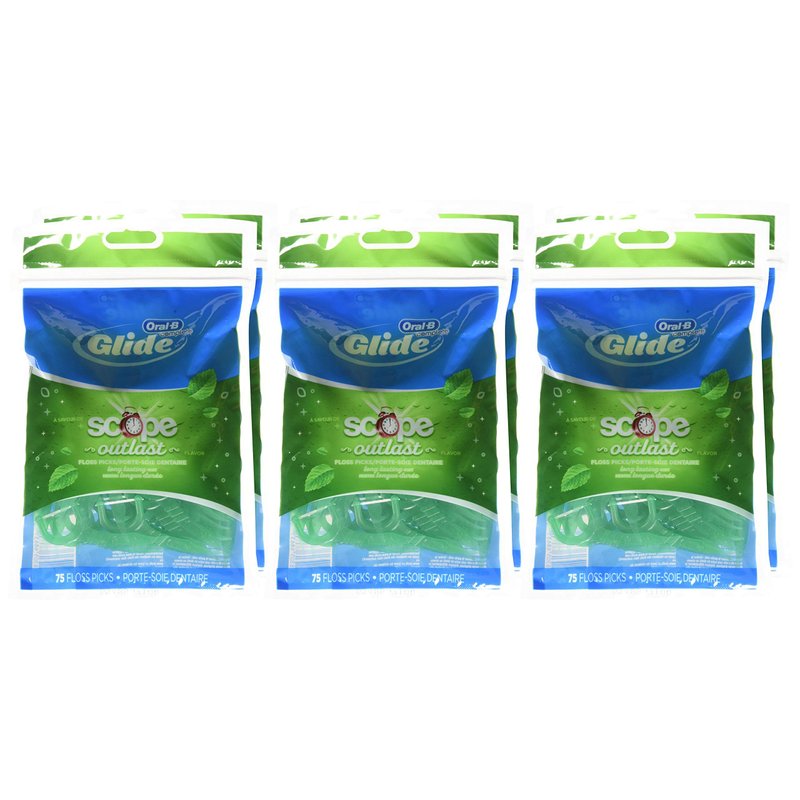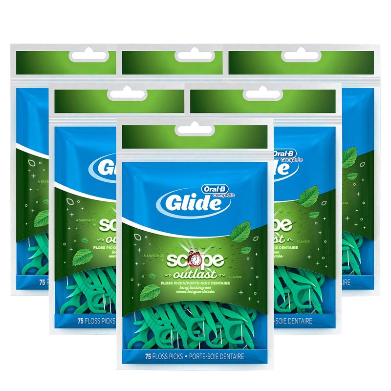 Oral-B Complete Glide Plus Scope Outlast dental floss selections, long-lasting mint, 75 dental floss picks, pack of 6 | ?? Exclusive: The Oral-B Complete Glide floss spines + the Scope Outlast flavor combine the freshness of the Scope flavor and the soft, silky texture of Glide dental floss with the ease of selection. Sliding floss tips glide more easily in tight spaces and effectively help remove plaque and food particles between the teeth and just below the gum line. Floss instructions: Hold the handle and guide the floss between the teeth with a gentle back and forth motion. Move the floss up and down against the tooth to remove plaque and food particles above and below the gum line. Rinse the floss as needed (repeat each tooth). Selection instructions: Place the selection tip between the teeth at the gum line. It uses a gentle movement in and out to remove plaque and food particles and stimulate the gums. Rinse as needed. Warnings: Adult supervision is recommended for children under 10 years old. Your gums may bleed the first few times you floss. If bleeding persists or your gums remain red and swollen, see your dentist. Discard dental floss after use.