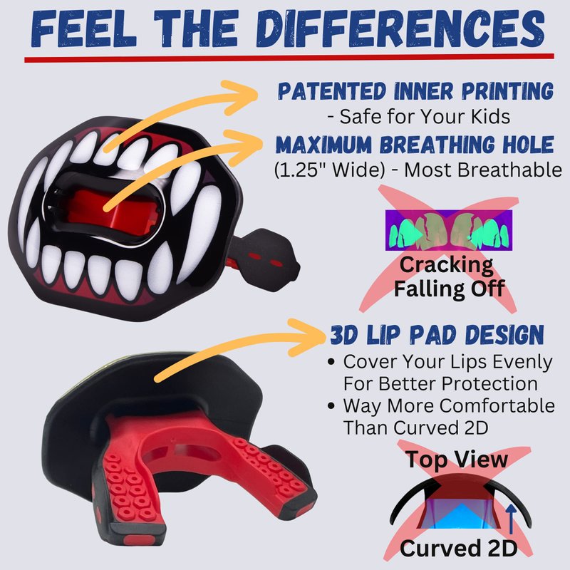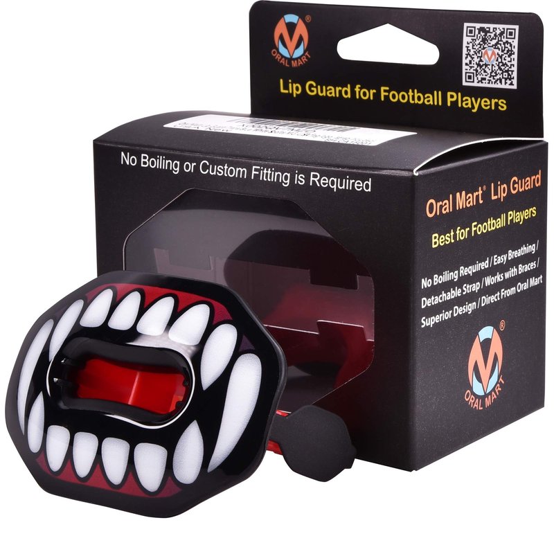Oral Mart Advantages - Football Mouth Guard (Vampire Fangs) - Below Are 6 Best Reasons You Should Buy Oral Mart Football Mouth Guards for You or Your Future Superstars! SUPERIOR DESIGN - Football players! "You Asked, we Listened!" We finally came up with this pacifier football mouth guard for you. There are USA flag, vampire fangs and 10 cool other best designs. MAXIMUM BREATHING HOLE (1.25" Wide) - Maximum Air Exchange Rate( 1.25" Wide) makes our Oral Mart Football Mouth Guard The Most Breathable Football Lip Guard. SPHERICAL 3D LIP PAD - As you probably are not aware, most of the lip guard protectors on the market are "curved 2D" instead of "Spherical 3D" Lip Pad but you can immediately tell the difference once you put it in your mouth. So Why "Spherical 3D" 1) Cover Your Lips Evenly. 2) Best Protection 3) Comfortable to Wear and Easily Fit in Mouth. NO BOILING REQUIRED - Instant Fit with No Extra Work. This Comes with Detachable Strap Included so you can wear It strapped or strapless, whichever you prefer. WORKS WITH BRACES – Protect Your Orthodontic Investment. BPA Free! Latex Free! Phthalate Free! This lip guard mouthpiece gives you maximum protection when you play football. PATENTED INNER PRINTING & Better Way to Secure Your Helmet Strap - 1) Prints or Inks Won't Come Off or Gray Out - Safe for Your Kids. 2) Strap Came Off? Strap Hole Became Loose? Focus On Your Games with Peace of Mind! Strap Through the Breathing Hole Directly - Safest Way.