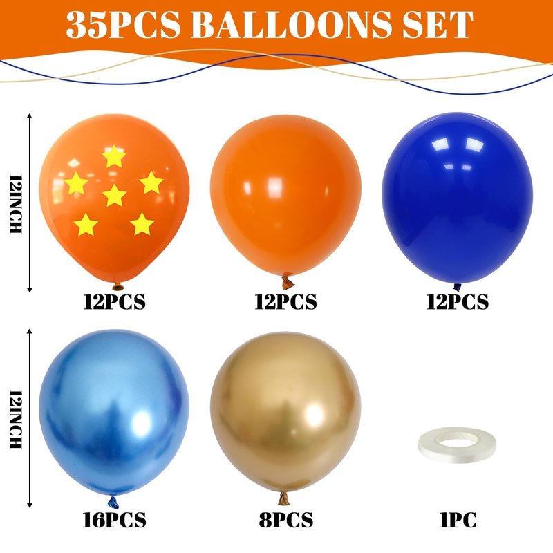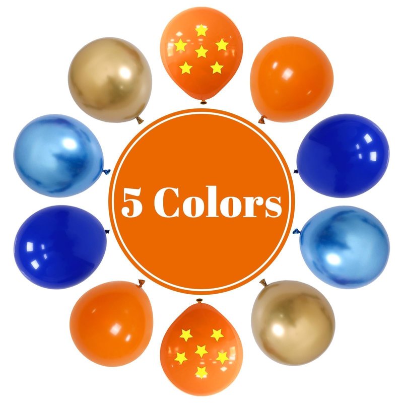 - 12INCH ORANGE BLUE BALLOONS: The package includes 35 pcs 12 inch balloons: 5 pcs orange star printed balloons, 10 pcs orange balloons, 5 pcs gold balloons, 5 pcs metallic blue balloons, 10 pcs royal blue balloons and 1pc 10m ribbon. Enough quantity and different colors for satisfying your various decoration needs!