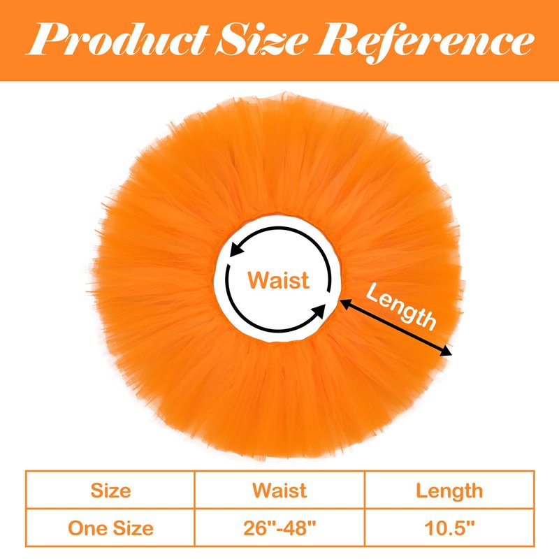 - SIZE INFORMATION: The tutu skirts for women is measuring approximately 10.5" in length. Our tutus are designed with a comfortable elastic waistband, which stretches approximately 26" to 48" in width and will fit most adult women.