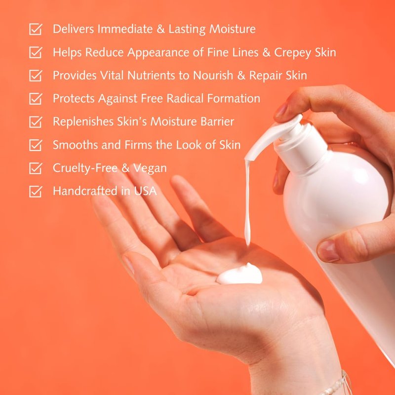 - Deeply Moisturizing & Nourishing: Our hand & body lotion is handcrafted with the finest natural and organic ingredients, including coconut oil, orange peel wax, rice ceramides, vitamin B5, and vitamin E to instantly and deeply hydrate and replenish dry, itchy skin. Also works great for crepey skin and as a working hands cream! This proprietary blend nourishes and gently moisturizes your skin, leaving it feeling soft, smooth, radiant, and naturally healthy.