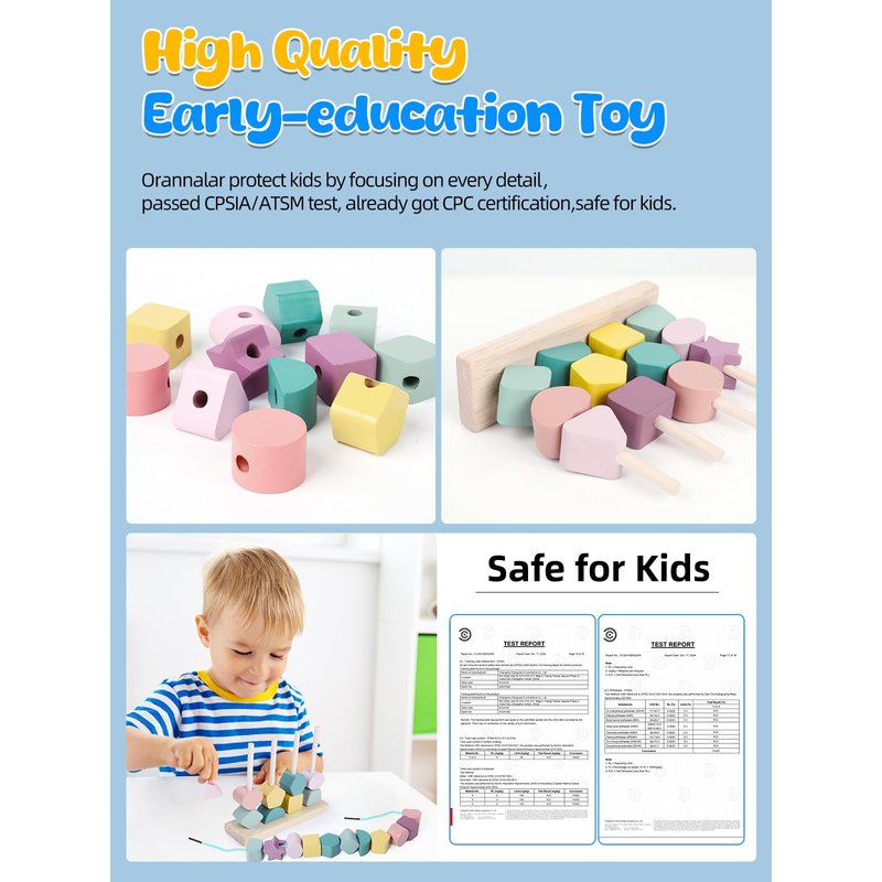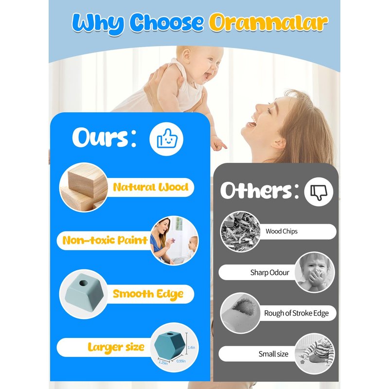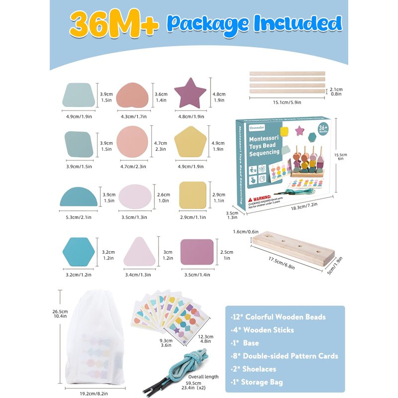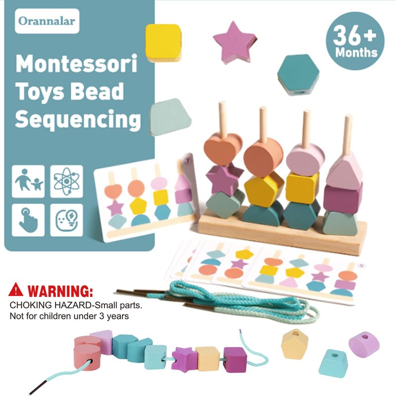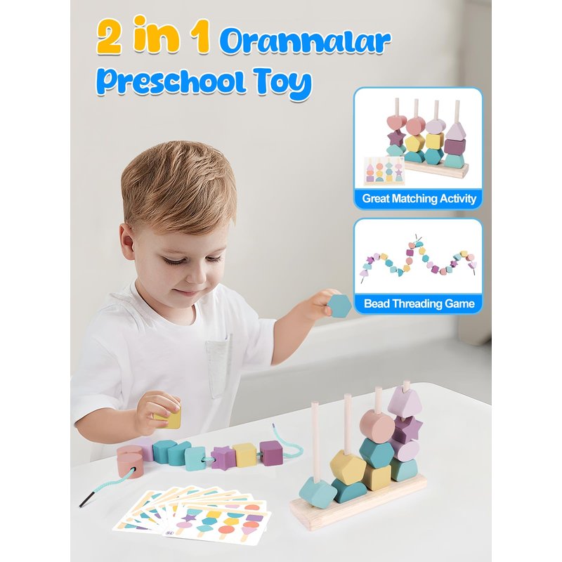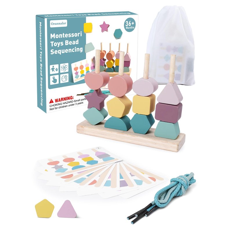 - 【2 In 1 Shape Sorter】Orannalar comes with 12pcs colorful wooden beads with various shapes / 1pc wooden stand / 2pcs laces / 4pcs wooden stick / 1pc storage bag and 8pcs double-sided pattern cards. There are multiple ways to play our Montessori toys for 3+, Stacking & matching wooden blocks on the wooden stand according to the pattern cards, threading beads, stacking up wooden blocks, or combining the blocks into a new patterns. The suitable size makes sure that toddlers can grasp it easily.
