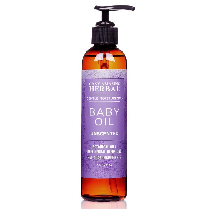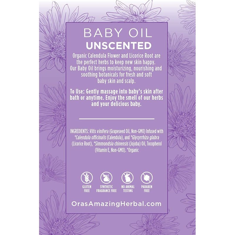 - Ora's Unscented Baby Oil is a deeply moisturizing and nourishing, natural, vegan, Baby Oil made of 5 simple ingredients: Organic Calendula and Licorice Root infused into Organic Jojoba Oil, Non-GMO Grapeseed Oil and Vitamin E.