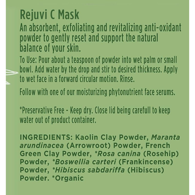 - Deep Pore Cleanse With Clay Powder Face Mask Using Highly Absorbent Organic French Green Clay, Kaolin Clay, vitamin C rich Rosehips and Hibiscus and the historical skincare magician Frankincense, Rejuvi C leaves your skin feeling deeply clean, soft and replenished.
