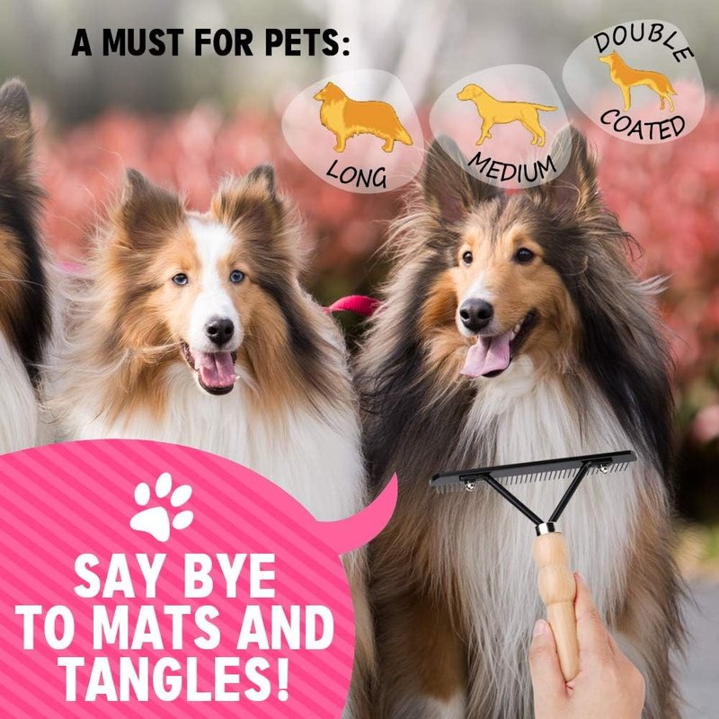 Ordermore Long Tooth Undercoat Dog Rake designed for breeds with thick, heavy coats and with undercoats, the precision tapered pins of this rake penetrate deep into your dog's coat to remove loose undercoat. Helps prevent matting when used regularly.Apply minimal pressure when using this Shedding Tool. Best Grooming Comb for Collies,Golden Retrievers,St. Bernards, Siberian Huskies,Newfoundlands,Chow Chows,Terriers and Schnauzers.
