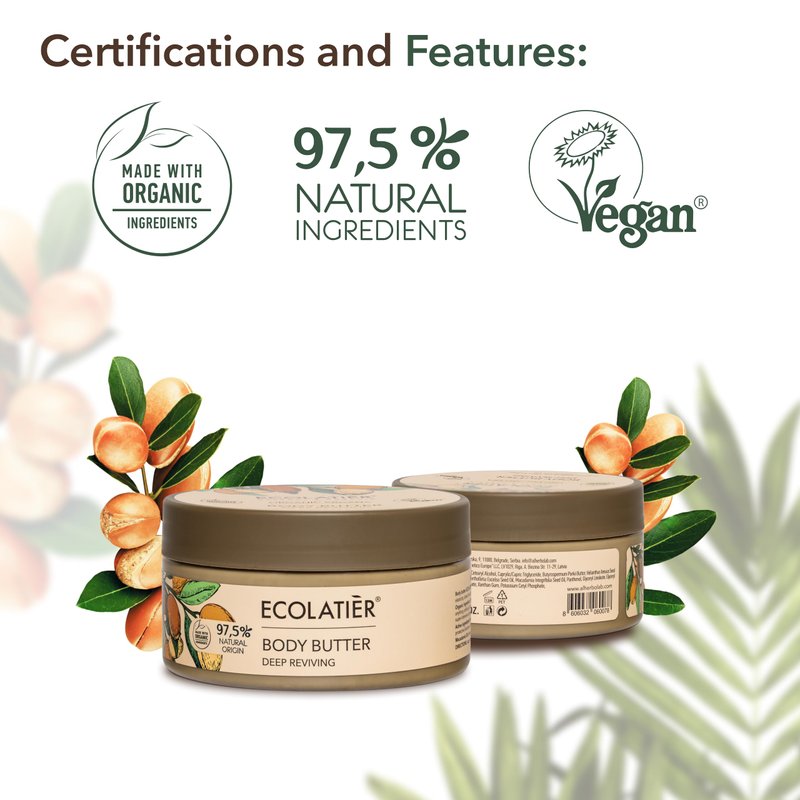 Transform your daily skincare ritual with ECOLATIER's Argana Body Butter, optimized for Body Butter for Women. Our specialized formula penetrates deep into the skin, offering nourishment and hydration that make your skin feel silky smooth and exceptionally healthy. The Efficacy of Organic Argana Oil: We use Organic Argana Oil that is cold-pressed and devoid of any artificial substances. This Argan Oil for Skin is a powerhouse of unsaturated fatty acids and Vitamin E, providing fast-absorbing and super-intensive nourishment that significantly boosts your skin's elasticity and hydration levels. Shea Butter: The Epitome of Nourishment: Our Argana vegan whipped body butter includes Shea Butter, a stellar ingredient known for its skin-enriching qualities. It enhances skin regeneration processes and fortifies the skin's protective functions, leaving it feeling soft and velvety as Argon Oil does. The Added Benefits of Macadamia Oil: Macadamia Oil further enriches the formula by softening the skin and providing deep moisture. This oil is rich in essential vitamins that contribute to skin health, making it a vital component of our Body Butter. Vegan Certified and Ethically Sourced: With a Vegan Certification and a 97.5% natural origin, our Argana Gel Body Butter aligns with ethical beauty standards and is safe for all skin types. How to Use: For a simple Argana Body Butter application, apply the butter to clean skin after a shower or as needed for extra hydration. The product is intended for external use only. Structure: Organic Argan Oil is cold-pressed and totally pure, untouched by any chemical or artificial substances. Rich in unsaturated fatty acids and vitamin E, it promotes skin health. Fast-absorbing and super-intensive oil penetrates into the skin, increasing its elasticity and hydration. Active ingredients: Shea Butter perfectly nourishes the skin, enhances regeneration processes, and boosts the protective functions of the skin.