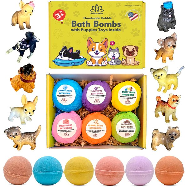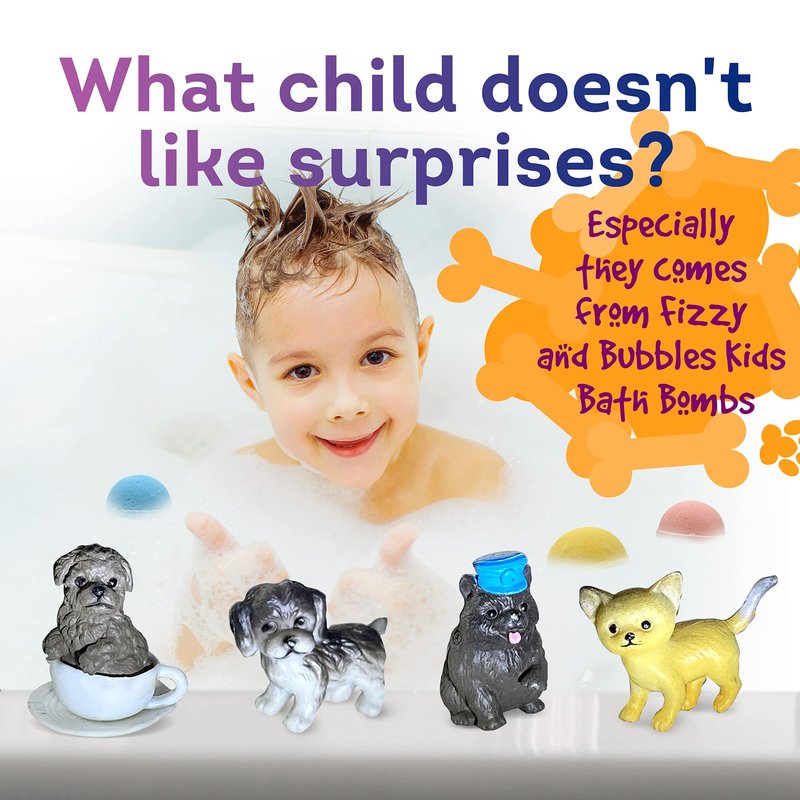 - BATH FIZZY WITH SURPRISE PUPPIES TOYS INSIDE: Bath time for little ones sometimes can be such a struggle, but not with Relaxcation bath bomb kit with PUPPIES toys inside. We know that children love surprises that`s why our organic bubble bath fizzies contain cool small toys inside that your kid will be so excited to play with!