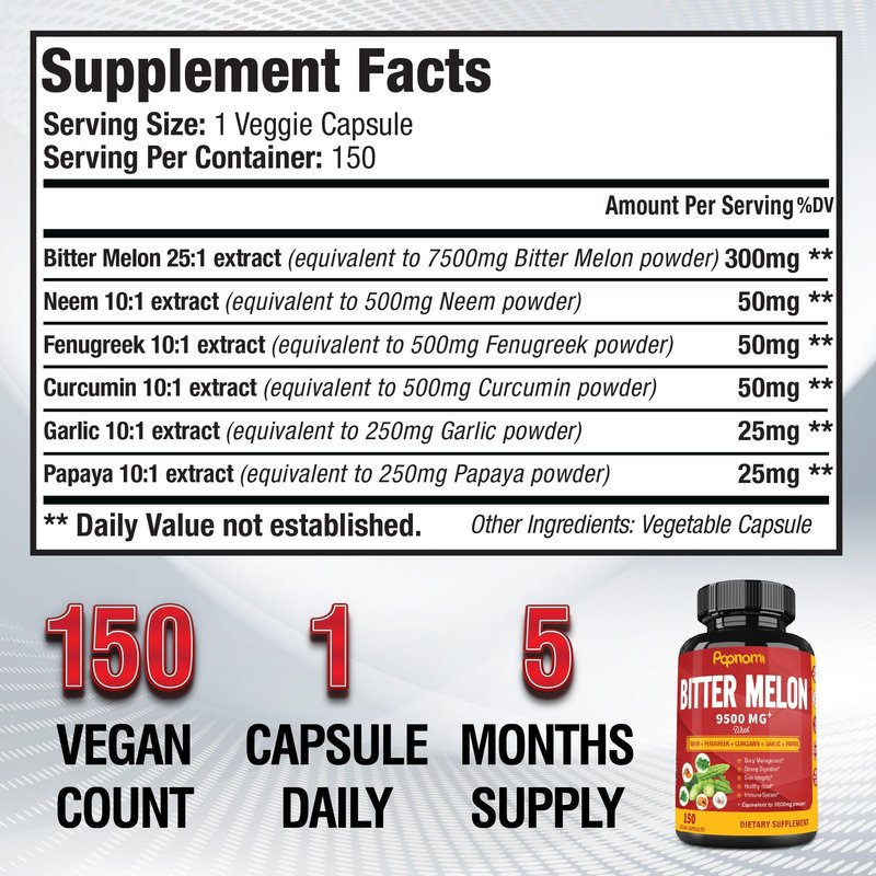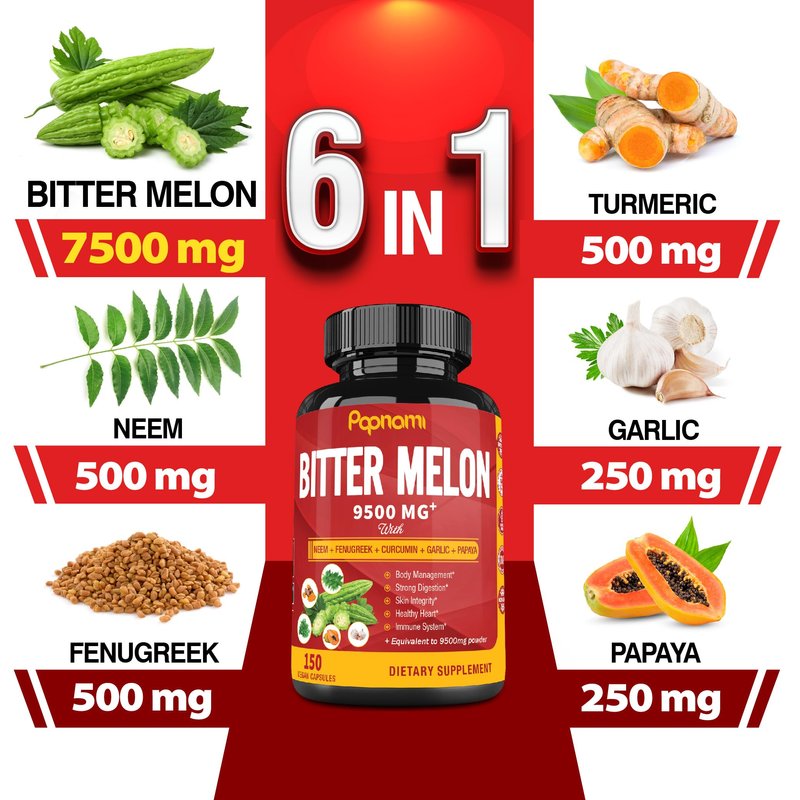 - Bitter Melon Supplement is derived from 6 ingredients, including Bitter Melon 25:1 extract, Neem, Fenugreek, Turmeric Curcumin, Garlic and Papaya; The professional formula is a natural and effective solution for a modern and healthy lifestyle.