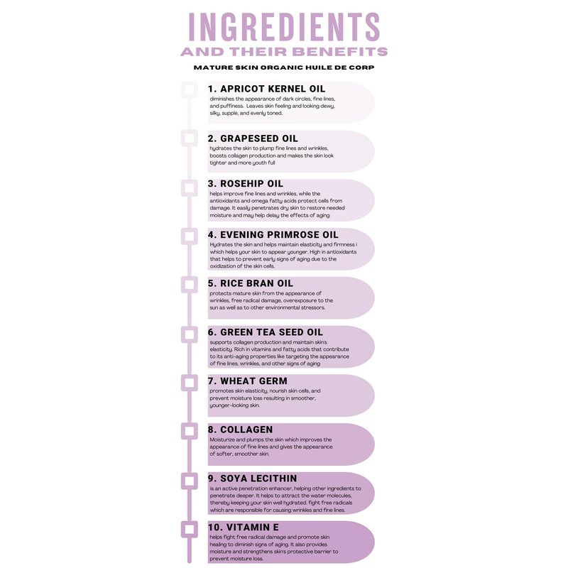 Our organic body oil for mature aged skin is a luxurious elixir crafted to rejuvenate and revitalize. Grapeseed oil, rich in antioxidants, teams up with fine line-reducing Rosehip oil and elasticity-promoting Evening Primrose oil. Green tea seed oil and Wheat Germ oil offer additional antioxidant support, leaving your mature skin nourished and glowing. Elevate your skincare routine with this anti-aging blend and indulge your skin in the richness it deserves.