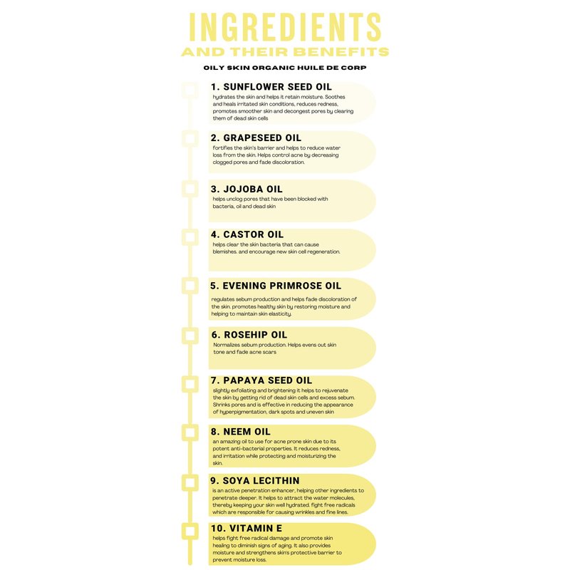Balance and purify your oily or acne-prone skin with our carefully crafted organic body oil. The oil-regulating power of Sunflower Seed Oil meets the acne-fighting properties of Grapeseed oil, while Neem Oil combats acne-causing bacteria. Evening Primrose and Rosehip Oil provide additional benefits, creating a non-comedogenic formula that not only balances oil production but also promotes a clear and healthy complexion. Embrace the beauty of balanced and clarified skin with this transformative blend.