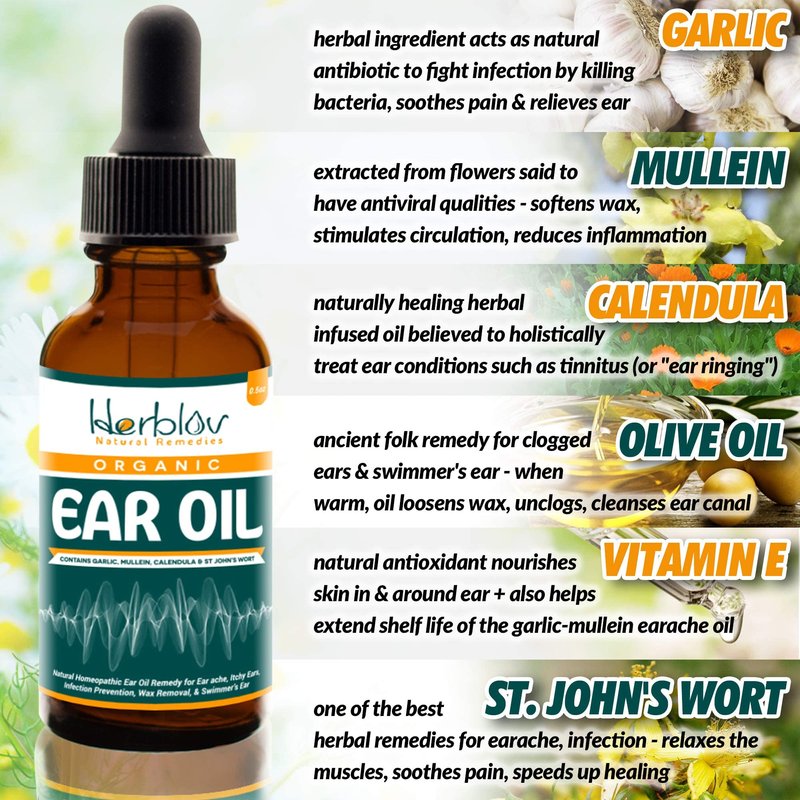 - NATURAL EAR ACHE RELIEF DROPS: Packed full of antioxidants & natural healing, our ear ache oil prevents earaches, infection & wax buildup. Blend contains mullein, garlic, calendula, vitamin E, Olive Oil, St. John's Wort.
