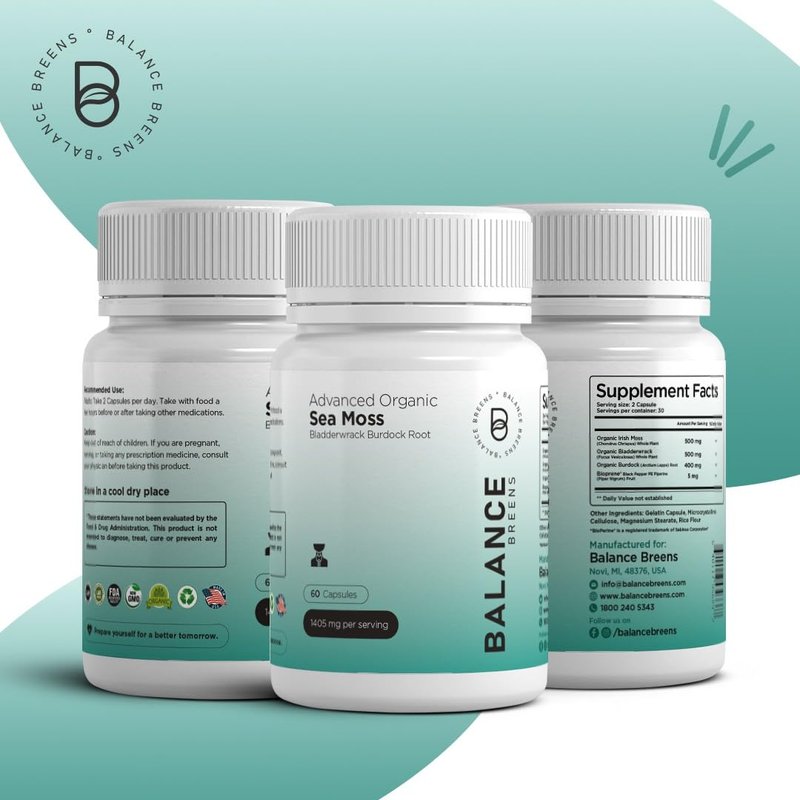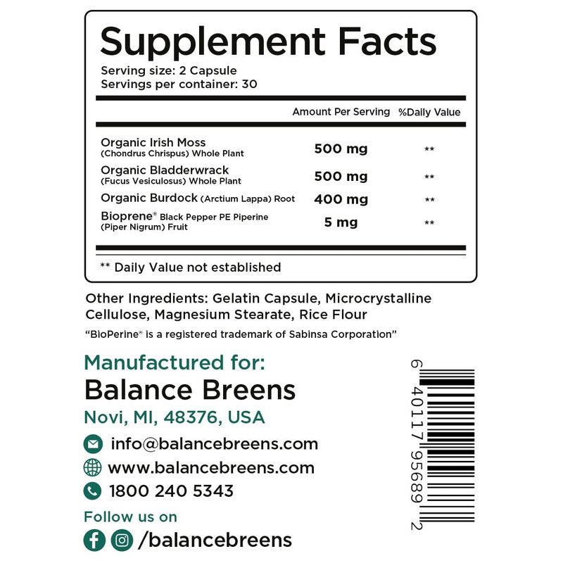 The Balance Breens Organic Irish Sea Moss Supplement With Bladderwrack, and Burdock Root is an essential dietary supplement that contains high content of amino acids, antioxidants, and vitamins. This multivitamin supplement helps support gut health and digestion, build immune system, supports Improved function and helps you get vibrant skin and hair