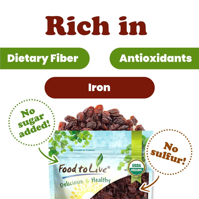 - ✔️VERSATILE: Organic Sultana Raisins by Food to Live are great for baking. Add them to muffins, cookies, and panettone. Use for meat sauces, stews, salad bowls, or add to cereal, yogurt, trail mixes, and granola bars.