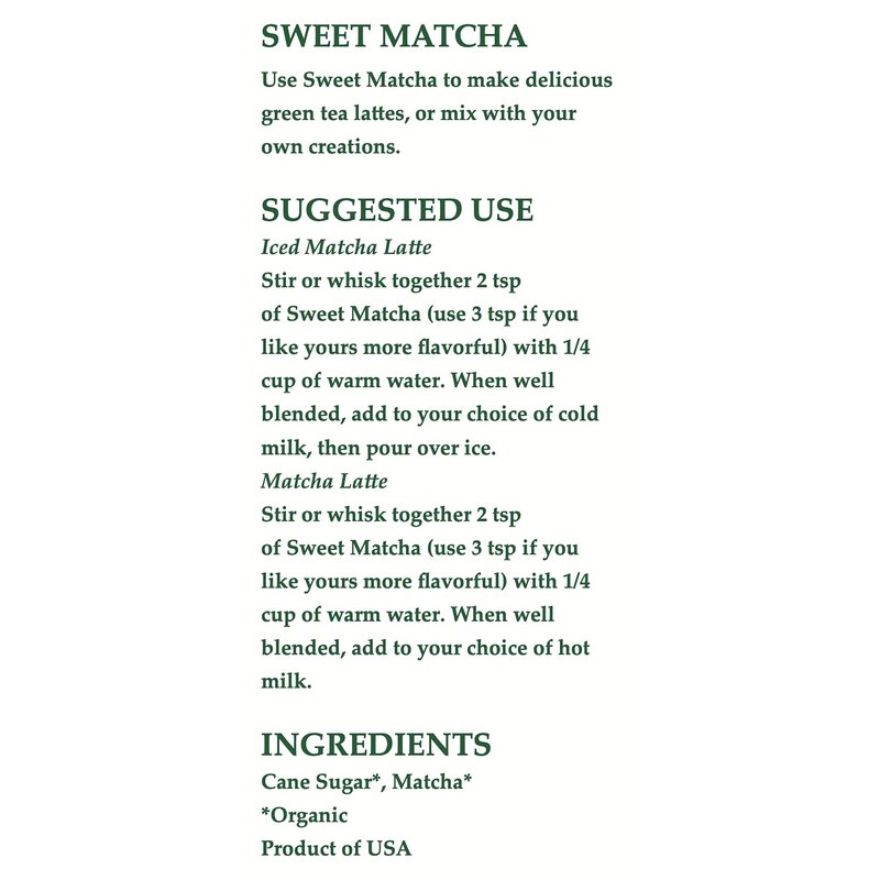 Suggested Use: To make an Iced Matcha Latte, stir or whisk together 2 tsp of Sweet Matcha with 1 cup of your milk of choice. When well blended, pour over ice. To make a Matcha Latte, heat 1 cup of milk to just under a boil. Stir or whisk in 2 tsp of Sweet Matcha until well blended.