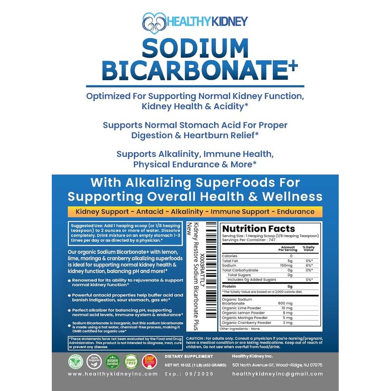 - Our natural organic use Sodium Bicarbonate+ powder alkaline supplement with alkalizing superfoods designed to support normal kidney function & kidney health. Safe fast acting antacid for the stomach, an electrolyte which alkalizes & buffers acid for supporting immune health, sports performance & more. Rejuvenate kidney health, support normal elimination of kidney & body acid, stop the burning, acid indigestion, sour stomach w/ this unique organic use sodium bicarbonate.