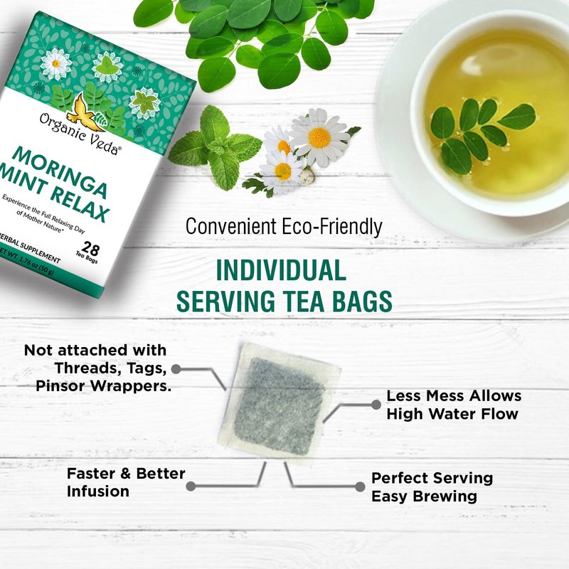 Organic Veda Moringa Mint Relax Tea Bags – USDA Organic Herbal Tea Made from Moringa Leaf, Mint, Chamomile flower and Ayurvedic Herbs for Mind Relaxing - 28 Count Tea Bags