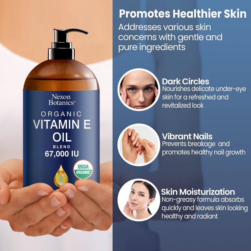 - Nailcare: The rich nourishing properties of our pure organic vitamin E oil strengthen brittle nails, calm dryness, and reduces breakage. Promotes nail growth and smooths rough texture for a polished look.