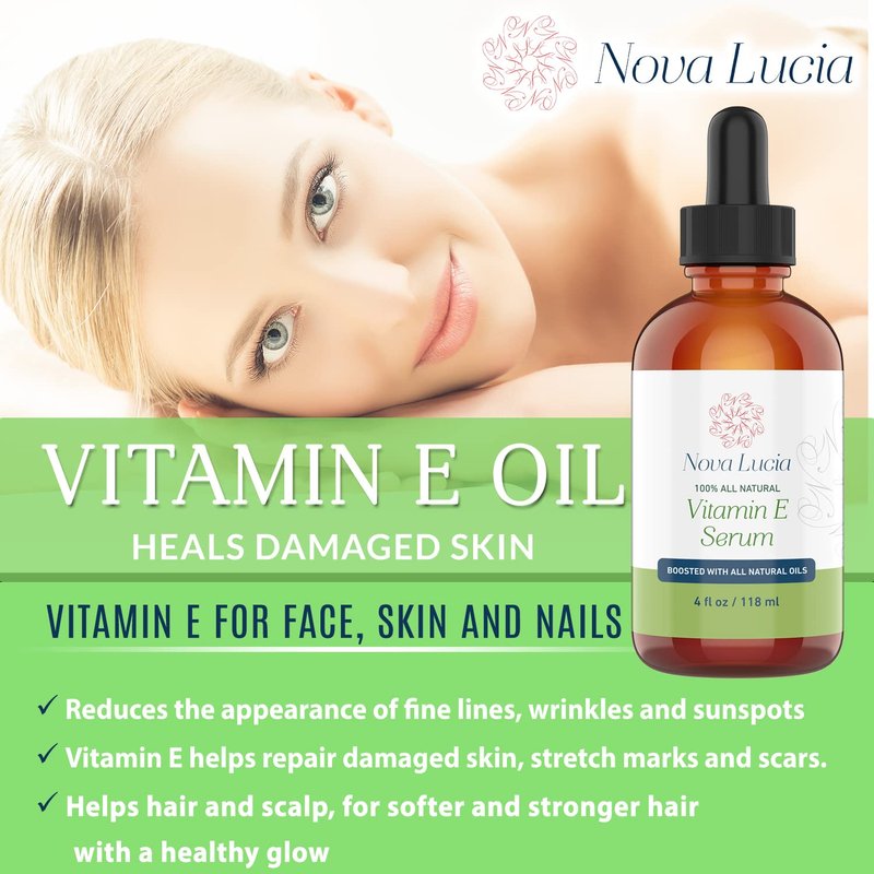 - BREAKTHROUGH CLEANSING & REJUVENATING OIL, SUPERIOR TO VITAMIN E SOFTGELS, CAPSULES OR CREAM - Nova Lucia's Vitamin E Oil has anti-aging qualities and is ideal for skin, hair, & nails. Contains potent blend of antioxidants to keep cell membranes healthy & hydrated. It's moisturizing benefits support nail health by preventing cracked cuticles & brittle yellow nails. A great alternative for hair oil it helps enhance natural hair oil production for stronger, shinier hair.