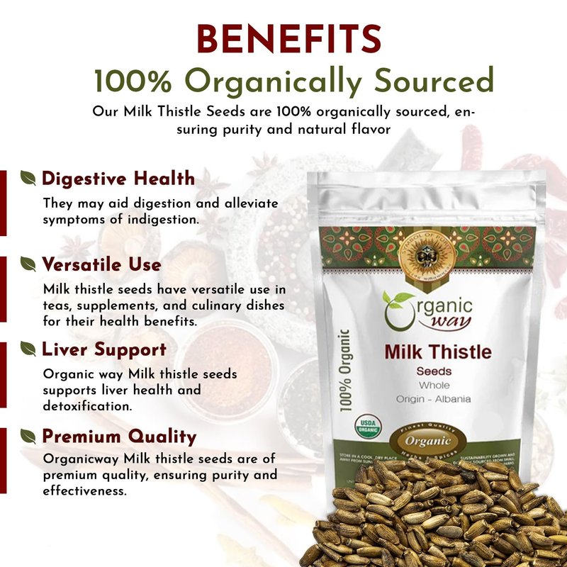 Milk thistle (Silybum marianum) is a flowering plant that comes from the same family as the daisy. Also known as Mary thistle or holy thistle, the milk thistle plant is native to the Mediterranean region, although it is commonly found across the globe. This prickly plant has distinctive purple flowers and white veins, which traditional stories say were caused by a drop of the Virgin Mary’s milk falling onto its leaves. Used in herbal tea blends, milk thistle offers various benefits, including support for liver function, immune system stimulation, and skin health—milk thistle has a slew of health benefits that can be harnessed to bolster whole-body health. Organic Way is a recognized producer of original milk thistle seeds with excellent quality. You can rely on our products for authenticity and potency. Organic Way imports quality organically grown products from different countries and processes them in the USA for the US market.
