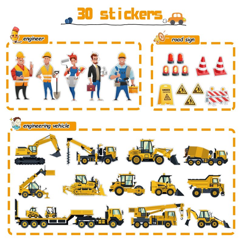 - Big Construction Engineering Fleet - This toys playset has 12 construction vehicles, including excavator, bulldozer, forklift, mixer truck, tractor, dump truck, road roller etc. we have one heavy flatbed trailer transport together in this set, which can used to Ship the construction toy vehicles. Except for the toy fleet, there are various traffic road signs and stickers, totally 57pcs of the set which will make your little boy have endless gaming fun.