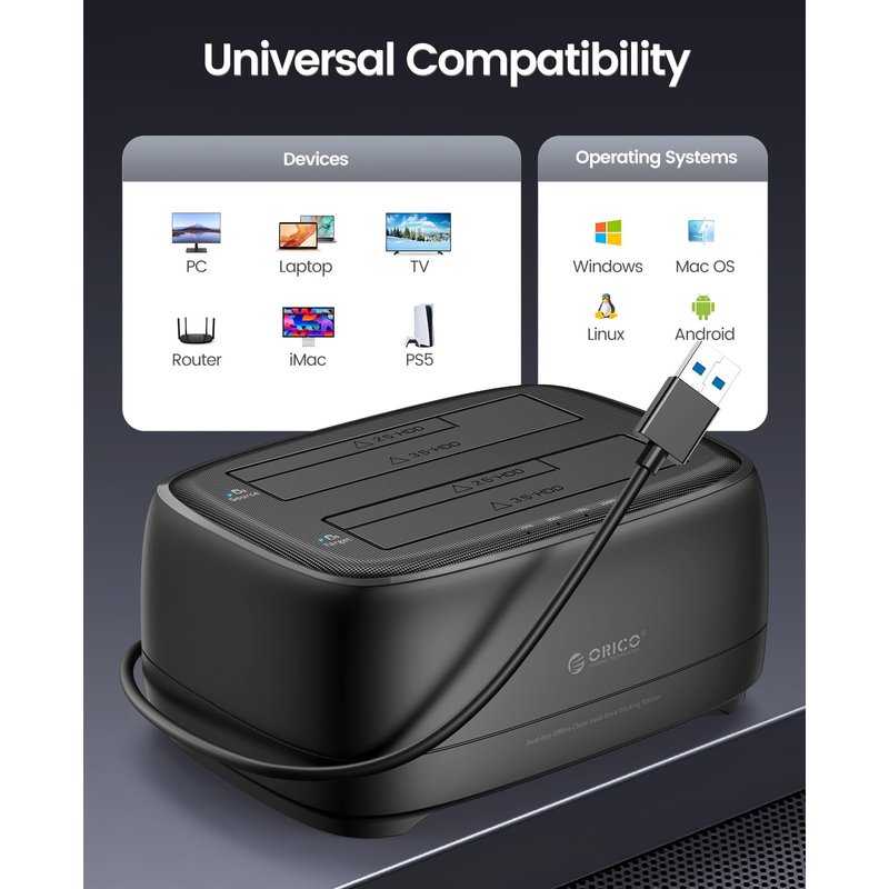 Our dual-bay external hard drive docking station is compatible with various devices, including PCs, laptops, smart TVs, routers, and gaming consoles like the PS4. Plus, it's compatible with multiple operating systems, including Windows, Mac, Linux, iPad OS, and Android.