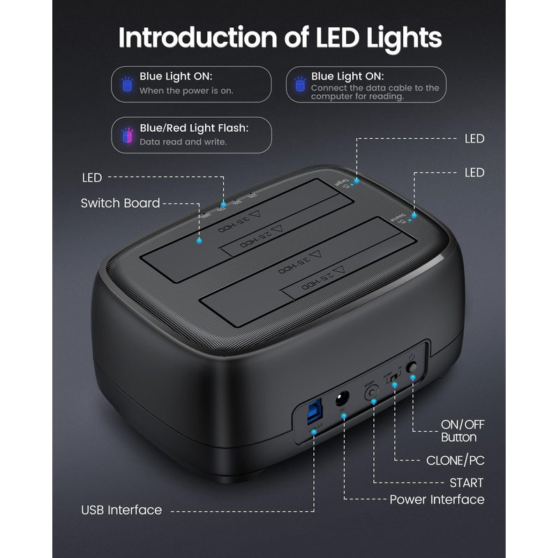 - 【Application Design】The hard drive cloner adopts a unique dust-proof design cover plate and silicone anti-skid pad and is also designed with LED cloner Status indicators-Blue reading, Red Transfer