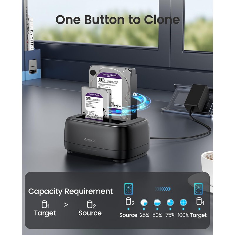 - 【Offline Clone Hard Drive Duplicator】ORICO hard drive docking station supports an offline clone function, it can be used to clone an existing hard drive without connecting to a computer, easy to duplicate data from one to another hard drive by pressing the CLONE button for about 3 seconds. Please note the target disk must be larger than the source disk.